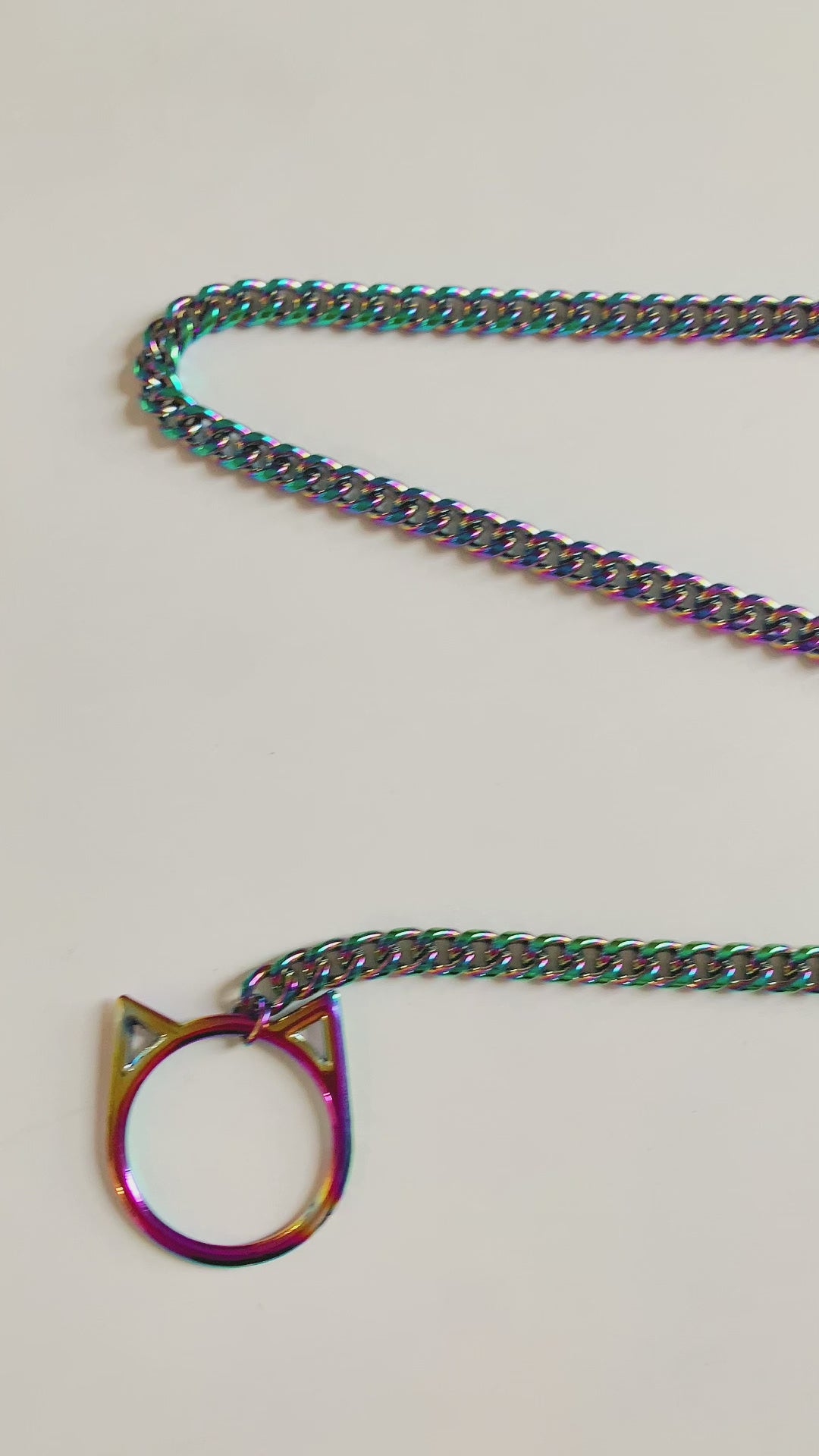 Add a playful yet edgy touch with this iridescent cat O-ring slip chain necklace. The rainbow shine and cute cat detail create a bold Y2K punk look.