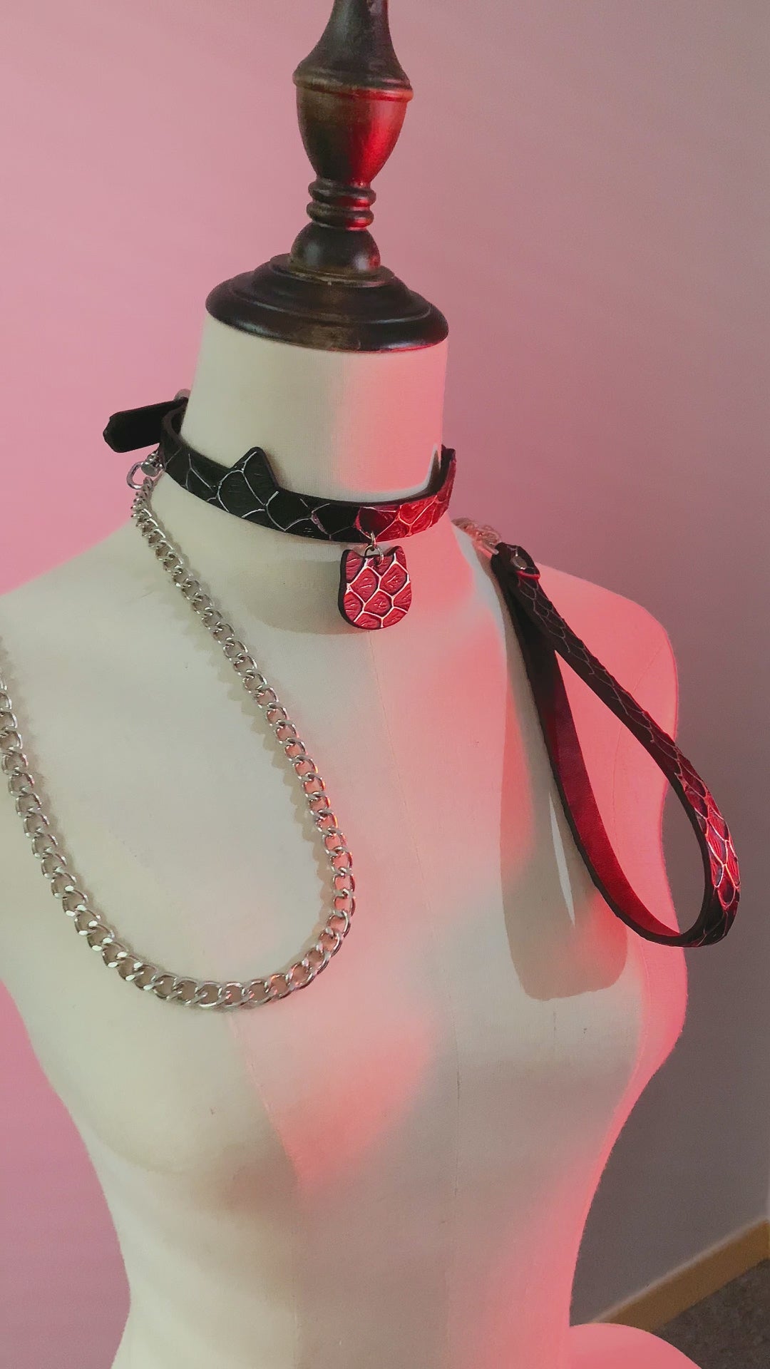 A handmade black scale leather collar and chain leash set inspired by feline aesthetics. Sleek, bold, and expressive — perfect for gothic fashion, cosplay, or statement everyday wear.
