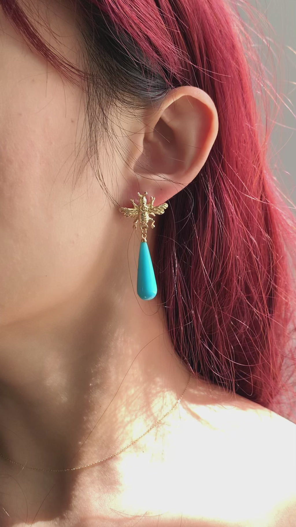 Our bee earrings combine a whimsical design with graceful elegance. The gold bee symbolizes diligence and harmony, while the soft blue teardrop adds a refreshing touch of color. Perfectly blending charm and sophistication, these earrings bring nature-inspired beauty to your look.