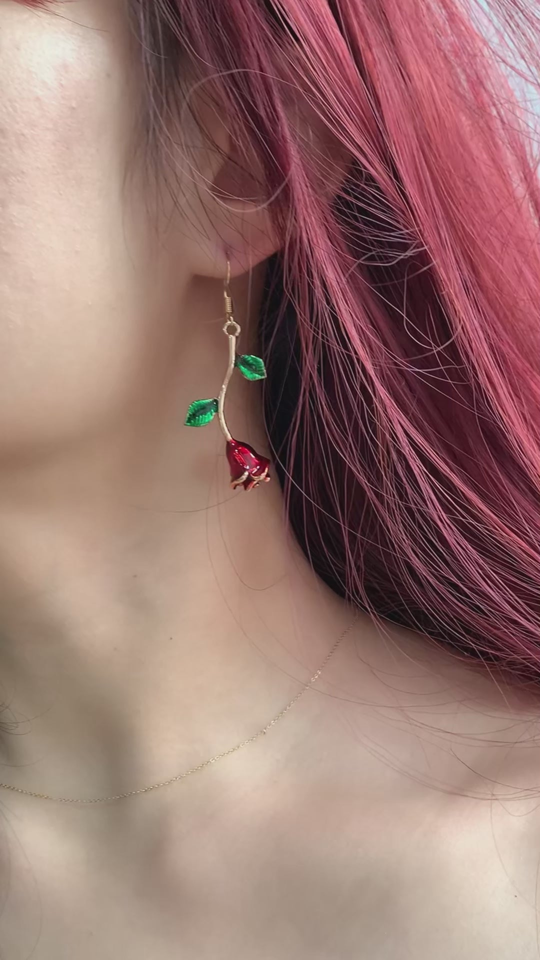Our rose earrings feature a blooming red rose with delicate green leaves and a graceful gold-tone stem, capturing the timeless beauty of nature. Romantic and artistic, these earrings add a soft yet striking touch to any outfit.