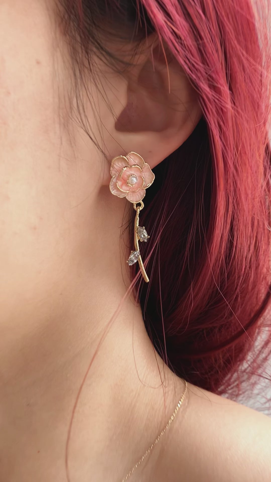 These exquisite earrings feature a pink camellia flower design, symbolizing elegance and love. The soft enamel petals and shimmering rhinestones create a delicate yet eye-catching look that adds a romantic touch to any outfit.