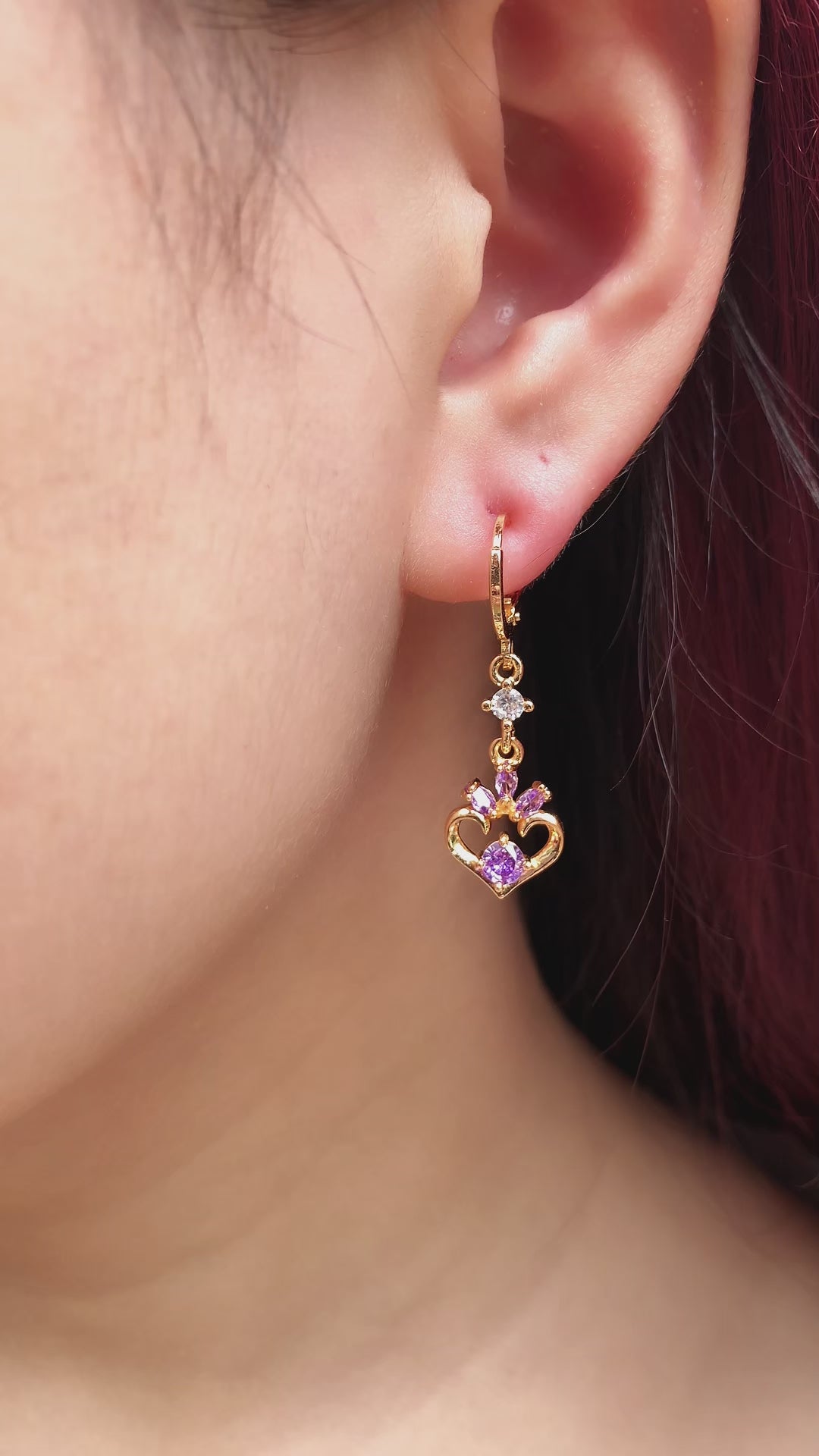 These dainty heart earrings feature a romantic open-heart design, adorned with shimmering purple cubic zirconia stones and a floral-inspired crown motif. The elegant gold-tone finish and refined details highlight a graceful, feminine aesthetic—perfect for expressing love with style.
