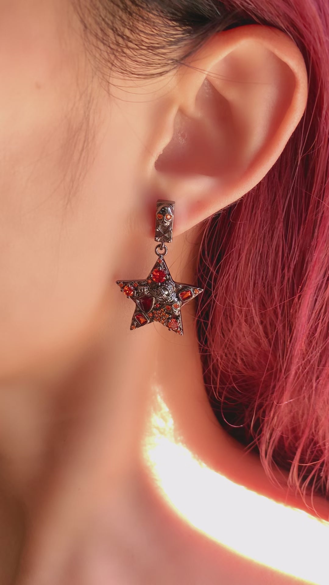 【Gothic Pentagram Skull Earrings with Red & Orange Crystals】
