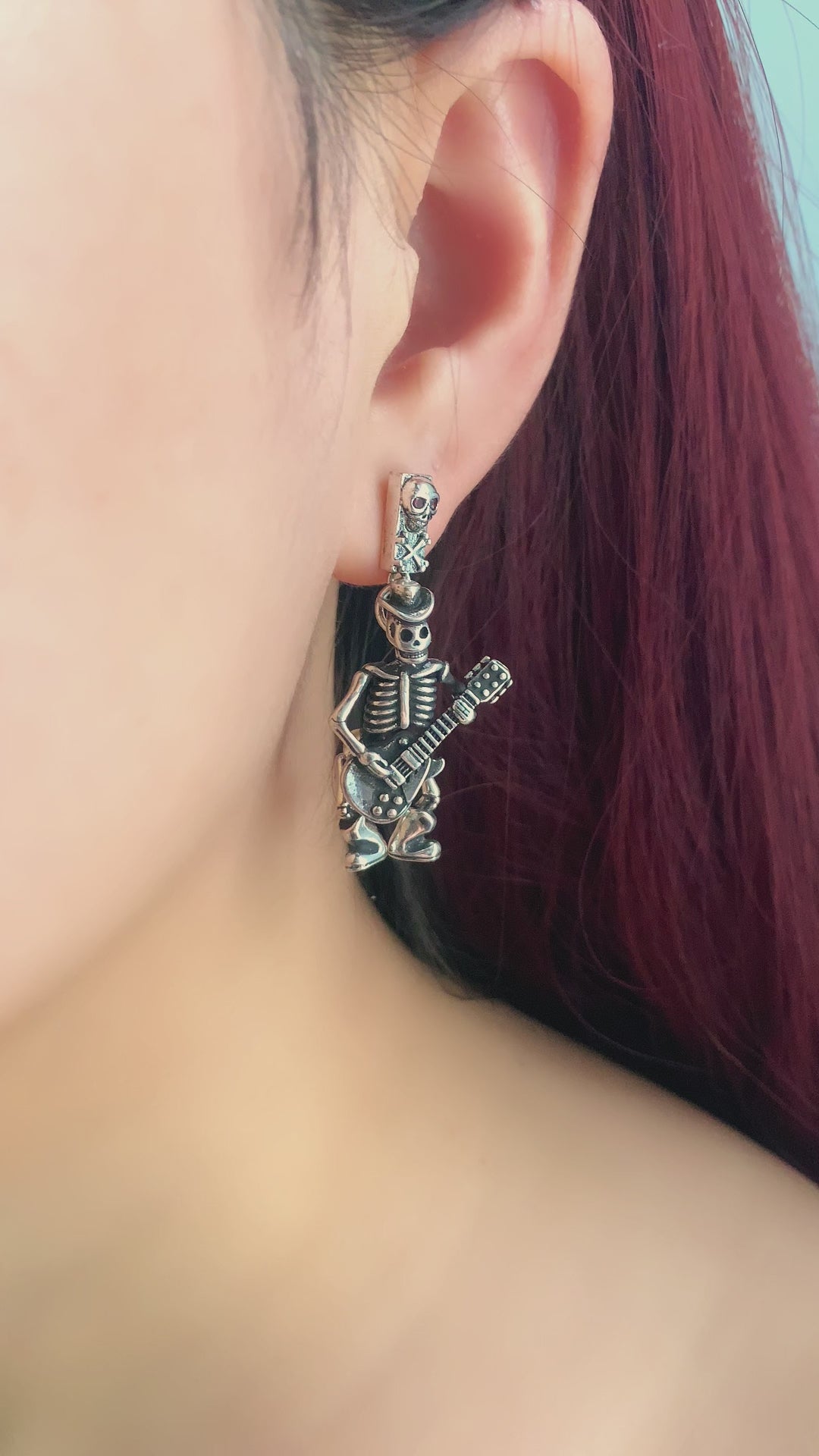 These 925 sterling silver skeleton guitar earrings feature a playful skeleton rocking out with a guitar, adding a bold punk-rock vibe to your style. With intricate detailing and a unique design, they are perfect for those who love music, gothic fashion, and statement accessories.
