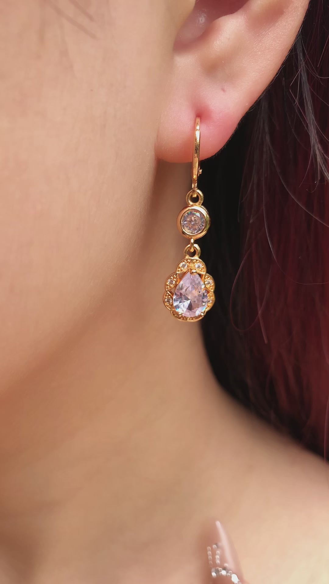 Our teardrop dangle earrings blend timeless elegance with shimmering brilliance. The classic pear-cut cubic zirconia stones are encircled by a delicate halo, exuding vintage charm and refined sophistication. Perfectly crafted to catch the light at every angle, they bring radiance to your every move.