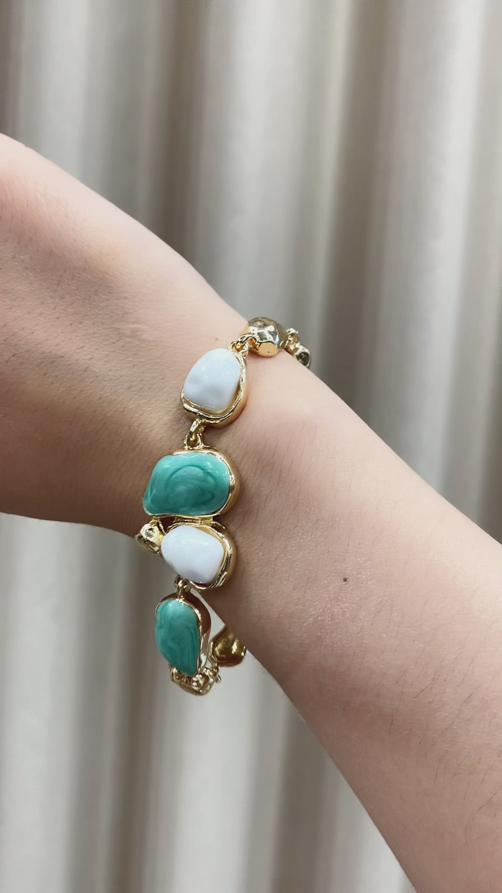 This bracelet features vibrant resin gemstones set in a handcrafted silver-tone frame, blending natural charm with artistic design. The colorful elements and organic textures reflect a free-spirited Boho vibe, adding unique flair to your everyday or special-occasion style.